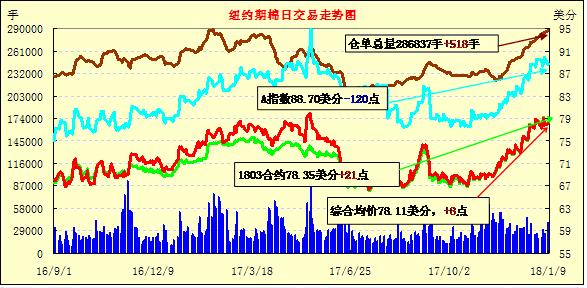 9日紐約期棉市場成交量下滑,價格繼續(xù)小幅收漲,近月1803合約結算價78.35美分/磅,漲21點,1805合約結算價78.69美分,漲22點,1807合約79.03美分,漲18點。當日3月合約開盤短暫穩(wěn)定后向下波動,后跌至78美分遇買盤支撐反彈,交易后期震蕩上行,終以小幅下跌收盤。市場持倉量連日增加,但3月合約持倉呈減少趨勢。據分析,1月12日美國農業(yè)部將發(fā)布月度供需預測,報告發(fā)布前市場交易氣氛以觀望為主。美棉現貨銷售低馬棉花銷售勢頭尚可。外部原油價格漲至近三年高點。