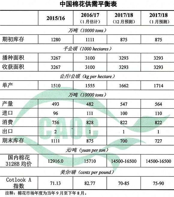 棉花:本月預(yù)測(cè),2017/18年度中國(guó)棉花播種面積3293千公頃,與上月預(yù)測(cè)數(shù)持平。單產(chǎn)為每公頃1714公斤,總產(chǎn)量564萬噸,較上月預(yù)測(cè)調(diào)增17萬噸,主要是由于近期新疆皮棉公檢量高于預(yù)期。2017/18年度棉花進(jìn)口量同比大幅增加,調(diào)增進(jìn)口量10萬噸至110萬噸。消費(fèi)形勢(shì)平穩(wěn),保持消費(fèi)量預(yù)測(cè)值822萬噸不變。受產(chǎn)量、進(jìn)口量增加影響,期末庫(kù)存量調(diào)增27萬噸至727萬噸。新年度國(guó)內(nèi)棉花供應(yīng)充足,價(jià)格短期有下行壓力,預(yù)計(jì)2017/18年度國(guó)內(nèi)3128B級(jí)棉花年度均價(jià)保持在每噸14500-16500元區(qū)間運(yùn)行。國(guó)際棉價(jià)近期受印度、巴基斯坦產(chǎn)量下滑影響快速上漲,暫調(diào)高國(guó)際棉價(jià)運(yùn)行中間值,預(yù)計(jì)CotlookA指數(shù)均價(jià)在每磅75-90美分區(qū)間運(yùn)行。
