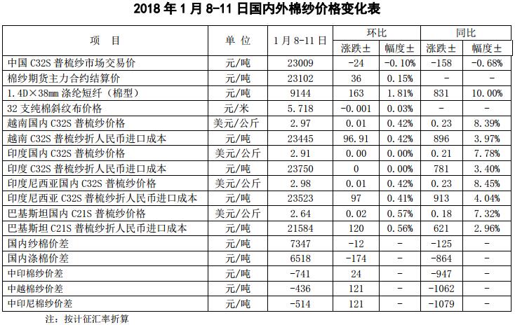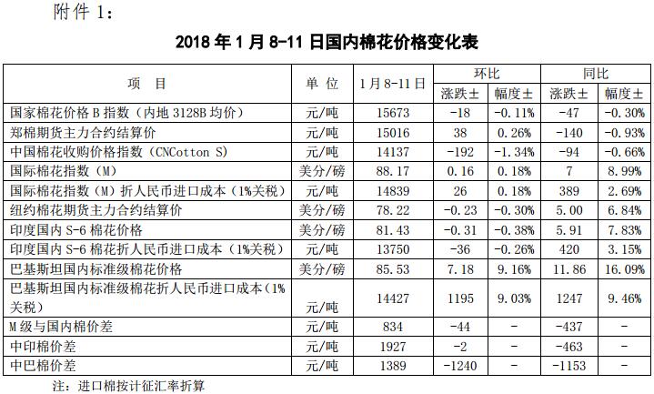 附件1:2018年1月8-11日國內(nèi)外棉花價格變化表