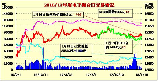 19日電子撮合交易成交量減少,整體合同均價(jià)全部收跌,整體合同下跌幅度較小,其中MA805成交量較大,為1750噸;活躍交投的合同多集中于遠(yuǎn)期合同,整體訂貨量總量有所減少,其中MA1805訂貨量最大,累計(jì)訂貨量為7330噸。截止到2018年1月18日24時(shí),新疆地區(qū)皮棉加工總量487.15萬噸,同比增加23.5%。其中兵團(tuán)加工量149.70萬噸,地方加工量337.46萬噸。日增量0.93萬噸。 近期,期貨價(jià)格整體從15000元/噸逐步上行,現(xiàn)貨市場價(jià)格略有變動(dòng),質(zhì)量較好的棉花價(jià)格上浮100-200元/噸,北疆含雜2.5以下品質(zhì)較好的棉花價(jià)格略漲,質(zhì)量不理想的棉花價(jià)格穩(wěn)中有跌。