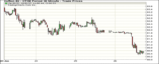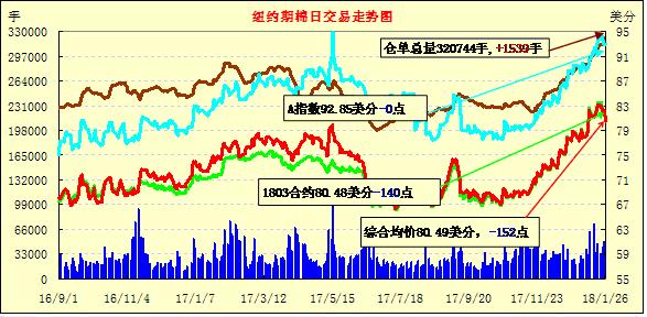 26日紐約期棉市場大幅度下跌,近月1803合約結(jié)算價80.48美分/磅,跌140點(diǎn),1805合約結(jié)算價81.22美分,跌136點(diǎn),1807合約81.72美分,跌134點(diǎn),2019年度合約下跌13-38點(diǎn)不等。當(dāng)日3月合約延續(xù)移倉交易,市場穩(wěn)定開盤后穩(wěn)定在81.5-82美分之間波動,美國農(nóng)業(yè)部出口周報發(fā)布后市場即出現(xiàn)跳水行情,在迅速跌破81美分后尾盤在80.5美分一線波動,終以大跌收盤。據(jù)美國農(nóng)業(yè)部(USDA),1.12-1.8日一周美國凈簽約出口2017/18年度陸地棉15354噸(含新簽約58491噸、取消前期訂單43137噸),較前一周減少75%,較近4周平均簽約量減少70%;裝運(yùn)2017/18年度陸地棉52730噸,較前周減少20%,較近4周平均減少12%。凈簽約出口2018/19年度陸地棉24449噸、皮馬棉295噸。外圍美元指數(shù)下跌,大豆期貨下跌,玉米和小麥期貨收漲。