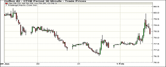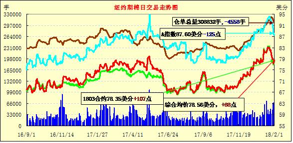 2月份第一個交易日紐約期棉市場大幅收漲,近月1803合約結(jié)算價78.35美分/磅,漲107點,1805合約結(jié)算價79.45美分,漲109點,1812合約75.42美分,漲91點。當(dāng)日3月合約上半場表現(xiàn)平淡無奇,美棉出口周報發(fā)布后市場迅速走高,交易后期重心向上突破78美分,并以大漲收盤。據(jù)美國農(nóng)業(yè)部(USDA),1.19-1.25日一周美國凈簽約出口2017/18年度陸地棉68787噸(含新簽約72711噸,另取消約3000多噸前期訂單),較前一周大幅度增加,較近4周平均簽約量增加50%;裝運2017/18年度陸地棉69185噸,創(chuàng)年度新高,較前周增加31%,較近4周平均增加21%。