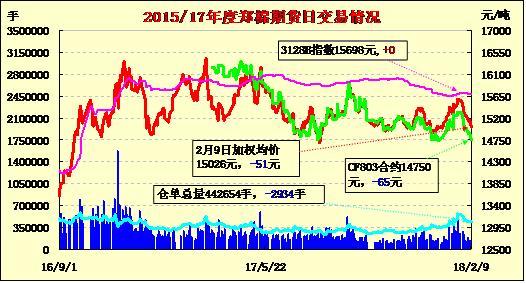 9日隔夜鄭棉回升震蕩,今日盤中在多頭平倉與空頭賣盤壓制下走低,日線形成陰線。日內(nèi)成交量萎縮,持倉量減少?;久媲闆r:棉花市場(chǎng)觀望增濃,部分紡企年前備貨接近尾聲,但表示如果價(jià)格下跌仍會(huì)適量采購,部分軋花廠節(jié)前已經(jīng)停止收購加工,部分內(nèi)地軋花廠3128級(jí)價(jià)格在14500-14600元/噸毛重,一企業(yè)疆棉巴楚庫3129級(jí)強(qiáng)度29報(bào)價(jià)在15400-15500元/噸公定,整體實(shí)單商談均有優(yōu)惠空間,隨著春節(jié)長假的臨近,多數(shù)廠家逐步準(zhǔn)備放假事宜,據(jù)調(diào)查93%的下游企業(yè)將在10日左右即將放假,即本周六左右,目前部分外地員工已逐步休假歸鄉(xiāng)。印度S-6軋花廠提貨價(jià)再次出現(xiàn)下跌,報(bào)39900盧比/坎地,約折79.2美分/磅,新花日上市量在2.92萬噸,環(huán)比縮減0.45萬噸。