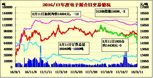 11日電子撮合交易成交量增加,近月合同平均價持穩(wěn),多數(shù)合同均價收跌。其中MA806成交量較大,為2920噸;活躍交投的合同多集中于遠期合同,其中MA1805訂貨量最大,累計訂貨量為6940噸。截止到2018年2月10日24時,新疆地區(qū)皮棉加工總量496.53萬噸,同比增加25%。其中兵團加工量150.31萬噸,地方加工量346.22萬噸,日增量0.04萬噸,加工進度放緩。截至2月10日,新疆皮棉的加工進度為98.3%,略慢于上個年度同期加工進度。棉花市場觀望增濃,部分紡企年前備貨接近尾聲,但表示如果價格下跌仍會適量采購,部分軋花廠節(jié)前已經(jīng)停止收購加工,部分內(nèi)地軋花廠3128級價格在14500-14600元/噸毛重,一企業(yè)疆棉巴楚庫3129級強度29報價在15400-15500元/噸公定。