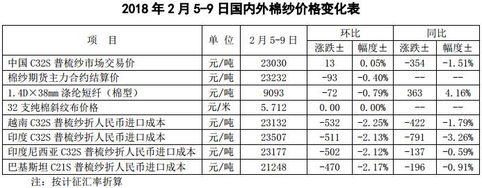 近期國(guó)內(nèi)棉紗產(chǎn)銷率提高,棉紗價(jià)格延續(xù)小幅上漲;外紗價(jià)格隨國(guó)際棉價(jià)繼續(xù)回落;國(guó)內(nèi)坯布市場(chǎng)進(jìn)入春節(jié)假期,純棉布價(jià)格無變化;滌綸短纖價(jià)格隨石油走勢(shì)下跌。