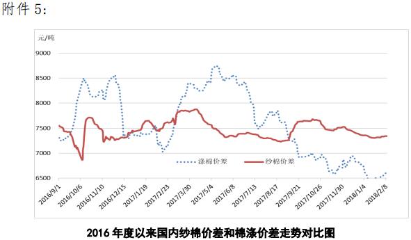 附件5:2016年度以來國(guó)內(nèi)紗棉價(jià)差和滌棉價(jià)差走勢(shì)對(duì)比圖