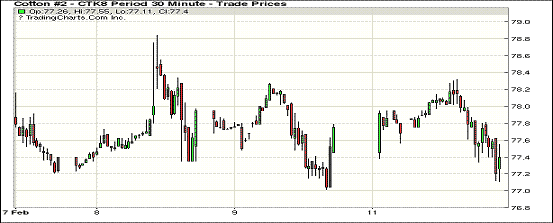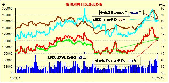 12日紐約期棉市場近跌遠漲,近月1803合約結(jié)算價76.45美分,跌23點;1805合約結(jié)算價77.45美分,跌18點;1807合約結(jié)算價78.44美分,跌14點;1812合約結(jié)算價75.74美分,漲22點。當日5月合約穩(wěn)定開盤,交易過程中重心整體向上突破78.3美分,后因賣盤打壓調(diào)頭向下,跌破77.4美分之后獲得少量買盤支撐短暫反彈至77.8美分,終因賣盤發(fā)力以小幅收跌。10日NCC(美國國家棉花總會)發(fā)布美棉下年度種植預期,2018/19年度植棉面積預期達到1307.8萬英畝,同比增加3.7%。其中陸地棉種植面積1282.4萬英畝,同比增加3.8%。皮馬棉面積25.4萬英畝,同比增加0.8%。新年度德州種植面積預計占比過半。