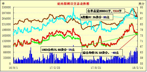 14日紐約期棉市場全面收跌,近月1803合約結(jié)算價75.60美分,跌78點;1805合約結(jié)算價76.97美分,跌43點;1807合約結(jié)算價78.00美分,跌42點;2019年度合約下跌22-37點不等。當(dāng)日5月合約低開低走,盤中獲買盤支撐幾度短暫反彈,試圖穩(wěn)定在77美分之上,但因賣盤壓力過重,最終以小幅收跌。連續(xù)三個交易日5月合約累計下跌66點。美棉銷售持續(xù)進(jìn)行中,據(jù)悉由于賣方注冊不及時,部分銷售量未能在出口周報中體現(xiàn)。外圍美元指數(shù)下跌,小麥期貨下跌,玉米和大豆期貨收漲。
