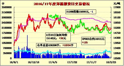 23日隔夜鄭棉震蕩,今日盤(pán)中在空頭回補(bǔ)支撐下震蕩走強(qiáng),午后重心上移,日線形成陽(yáng)線。日內(nèi)成交量放大,持倉(cāng)量增加?;久媲闆r:年后開(kāi)市第一天,棉花市場(chǎng)觀望較濃,部分商家仍未開(kāi)工,部分試探性報(bào)盤(pán),且尚未有詢盤(pán)響應(yīng),新疆庫(kù)機(jī)采3128/29級(jí)報(bào)價(jià)在15500-15600元/噸毛重左右。而市場(chǎng)人士反映,目前下游紗廠節(jié)前多備有一定庫(kù)存,而馬上面臨3月拋儲(chǔ),等待到時(shí)情況。