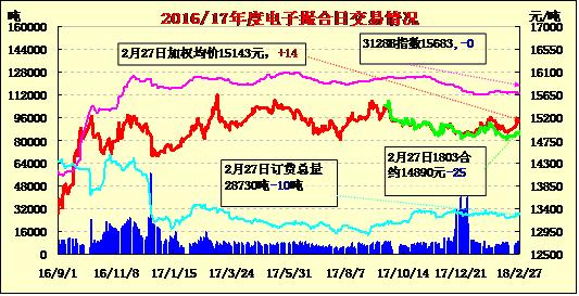 27日電子撮合交易成交量減少,合同均價(jià)多數(shù)收跌。其中MA1807成交量較大,為2380噸;活躍交投的合同多集中于遠(yuǎn)期合同,其中MA1805訂貨量最大,累計(jì)訂貨量為7640噸。紐約期棉5月合約穩(wěn)定開(kāi)盤,開(kāi)盤后交易重心迅速上行至當(dāng)日最高點(diǎn)82.52美分,后遇賣盤打壓跌勢(shì)明顯,跌至81美分處買盤入場(chǎng),市場(chǎng)走高,最終收漲。當(dāng)日收盤價(jià)為1月25日以來(lái)1805合約最高點(diǎn),連續(xù)兩個(gè)交易日累計(jì)上漲268點(diǎn)。