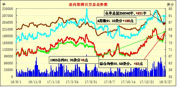 27日紐約期棉市場全面收漲,近月1803合約結(jié)算價81.76美分,漲6點(diǎn);1805合約結(jié)算價82.25美分,漲10點(diǎn);1807合約結(jié)算價82.79美分,漲4點(diǎn);1812合約結(jié)算價77.05美分,漲18點(diǎn)。2019年度合約上漲18-52點(diǎn)不等。當(dāng)日5月合約穩(wěn)定開盤后交易重心下滑,跌至81.15美分處觸發(fā)買盤,市場走高,之后在81.4-82美分波動區(qū)間內(nèi)震蕩運(yùn)行,在交易最后10分鐘獲得強(qiáng)有力支撐快速上沖,最終反跌為漲收盤。1805連續(xù)三個交易日累計(jì)上漲278點(diǎn)。外圍美元指數(shù)上漲,玉米、大豆和小麥期貨上漲。