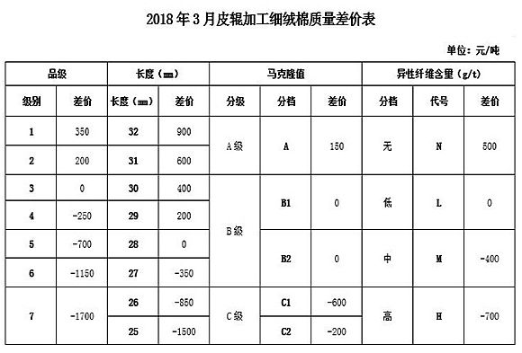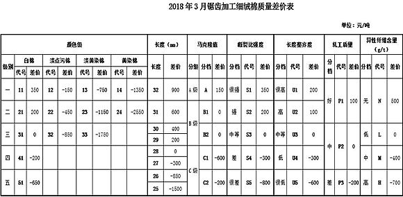 根據《中國棉花協會國產棉質量差價表管理辦法》規(guī)定,現正式發(fā)布2018年3月《鋸齒加工細絨棉質量差價表》、《皮輥加工細絨棉質量差價表》和《長絨棉質量差價表》(單位:元/噸)。