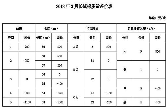2018年2月各地成交清淡,棉花報價與1月份基本持平。依據監(jiān)測點采集的市場價格數據、棉花公檢質量數據和中國棉花價格指數變動情況得出的2018年3月《鋸齒加工細絨棉質量差價表》、《皮輥加工細絨棉質量差價表》、《長絨棉質量差價表》,與上月相比,質量指標差價幅度保持不變。