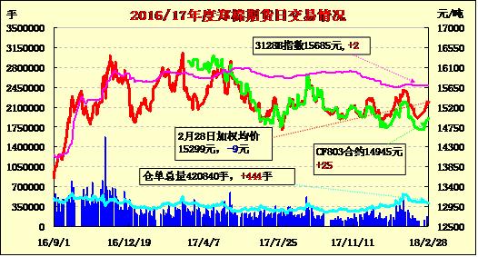 28日隔夜鄭棉回落震蕩,今日早盤受外棉上漲帶動(dòng)沖高,隨后高位震蕩,午后在平倉(cāng)盤壓制下調(diào)整,日線形成星線。日內(nèi)成交量萎縮,持倉(cāng)量減少?;久媲闆r:受外盤強(qiáng)勢(shì)帶動(dòng),鄭棉期貨也出現(xiàn)上漲,棉花現(xiàn)貨心態(tài)略好,河北地產(chǎn)4128級(jí)報(bào)價(jià)在14800-14850元/噸公定自提,疆棉手摘長(zhǎng)度28強(qiáng)度26/27山東庫(kù)自提價(jià)16300元/噸毛重,目前部分紡企開工,多使用節(jié)前采購(gòu)資源,而市場(chǎng)人士反映,目前下游紗廠節(jié)前多備有一定庫(kù)存,而馬上面臨3月拋儲(chǔ),等待到時(shí)情況。