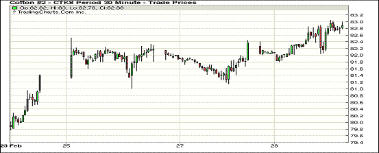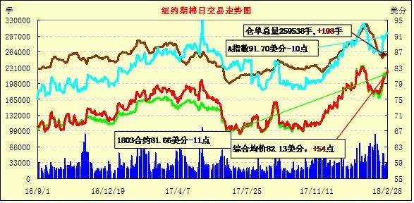 2月最后一個交易日紐約期棉小幅波動,主力合約漲勢延續(xù)。近月1803合約結(jié)算價(jià)81.65美分,跌11點(diǎn);1805合約結(jié)算價(jià)82.93美分,漲68點(diǎn);1807合約結(jié)算價(jià)83.29美分,漲50點(diǎn);1812合約結(jié)算價(jià)77.11美分,漲6點(diǎn)。當(dāng)日5月合約小幅高開后震蕩運(yùn)行,盤中獲得買盤支撐重心快速上行,后突破82.8美分之后受獲利了結(jié)盤承壓下行,跌至82美分附近買盤發(fā)力重心一路向上突破83美分,后小幅回落,最終小幅收漲。1805連續(xù)四個交易日累計(jì)上漲346點(diǎn)。外圍美元指數(shù)上漲,玉米、大豆和小麥期貨上漲。