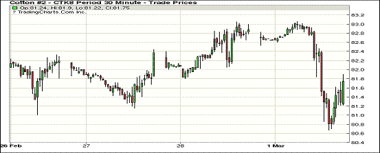 3月第交易日紐約期棉延續(xù)波動態(tài)勢,主力合約收跌。近月1803合約結算價82.57美分,漲92點;1805合約結算價81.81美分,跌112點;1807合約結算價82.11美分,跌118點;1812合約結算價77.18美分,漲7點。2019年度合約上漲20-62點不等。當日5月合約小幅低開,開盤后交易圍繞82.5-83.00美分之間波動,盤中短暫突破83美分,后賣盤發(fā)力,交易重心一路向下跌破81美分后尾盤在81.5美分一線波動,最終大幅收跌。美國總統(tǒng)特朗普表示美國計劃對進口鋼材和鋁分別征收25%和10%的關稅,消息一經(jīng)宣布,美國三大股指集體重挫。外圍美元指數(shù)下跌,玉米、大豆和小麥期貨上漲。
