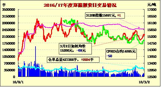 | CF803 | 14865 | 15000 | 14865 | 14915 | 14895 | -50 | 194 | -158 | 7542 | 2804 | -96 |