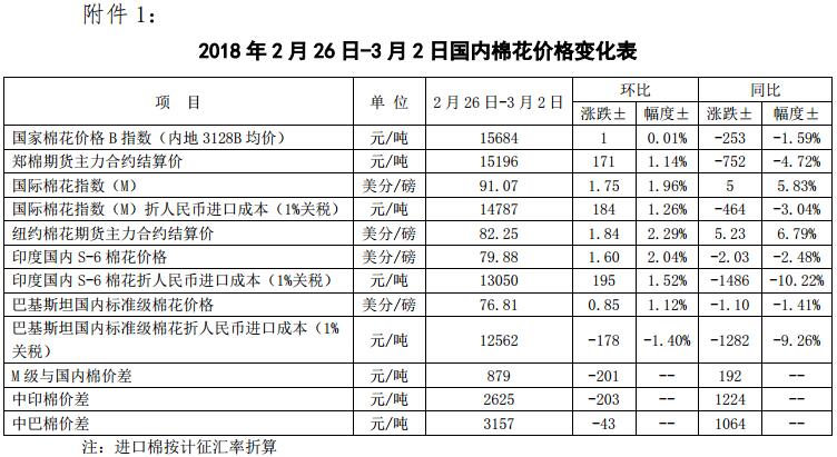 附件1:2018年2月26日-3月2日國內(nèi)外棉花價(jià)格變化表