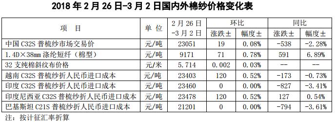 本周國內(nèi)紡企訂單小量增加,棉紗價(jià)格延續(xù)小幅上漲;外紗價(jià)格隨國際棉價(jià)繼續(xù)上漲;國內(nèi)坯布陸續(xù)啟動(dòng),純棉布價(jià)格出現(xiàn)上漲跡象;滌綸短纖價(jià)格隨原料PTA走勢(shì)回升。