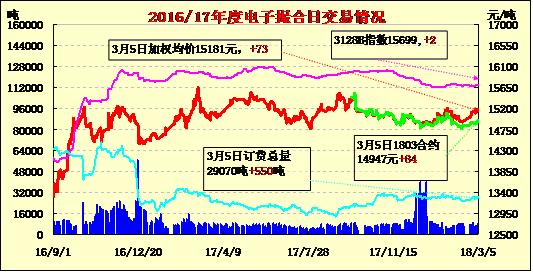 5日電子撮合交易成交量增加,合同均價(jià)全部收漲。其中MA1808成交量較大,為1980噸;活躍交投的合同多集中于遠(yuǎn)期合同,其中MA1807訂貨量最大,累計(jì)訂貨量為7450噸。市場進(jìn)入3月,下周中國將開始拋售低廉的儲(chǔ)備棉,南半球新棉即將上市,而本年度全球庫存均居于高位,整體市場供應(yīng)寬松,這將抑制期價(jià)的上漲,對(duì)反彈不可樂觀,繼續(xù)關(guān)注76-84美分/磅的橫盤區(qū)域。