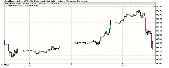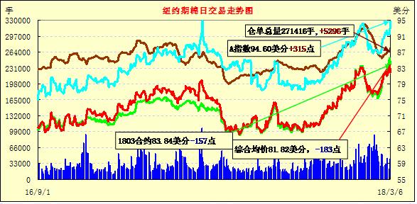 6日紐約期棉近跌遠(yuǎn)漲。近月1803合約結(jié)算價(jià)83.84美分,跌157點(diǎn);1805合約結(jié)算價(jià)82.43美分,跌280點(diǎn);1807合約結(jié)算價(jià)82.49美分,跌249點(diǎn);1812合約結(jié)算價(jià)77.95美分,跌111點(diǎn)。2019年度合約上漲7-19點(diǎn)不等。當(dāng)日5月合約小幅低開,在買盤支撐下交易重心上行突破86美分,圍繞86美分一線波動(dòng)運(yùn)行,最高觸及86.60美分創(chuàng)該合約新高點(diǎn),后賣盤在高點(diǎn)入場(chǎng)期價(jià)承壓出現(xiàn)斷崖式下跌,后在83.5-84.00美分區(qū)間波動(dòng),試圖穩(wěn)定在83.5美分一線失敗繼續(xù)掉頭向下,最終以大跌收盤,幾乎吐盡昨日漲幅。分析師指出,由于本周主力合約屢屢創(chuàng)下價(jià)格高點(diǎn),棉花市場(chǎng)處于超買狀態(tài)。外圍美元指數(shù)下跌,玉米期貨上漲,大豆和小麥期貨下跌。