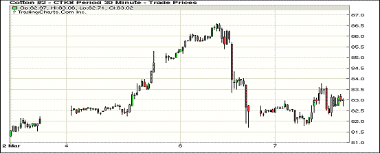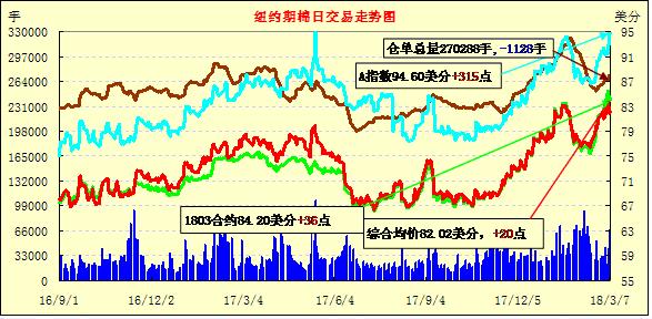 7日紐約期棉近漲遠(yuǎn)跌。近月1803合約結(jié)算價(jià)84.20美分,漲36點(diǎn);1805合約結(jié)算價(jià)82.86美分,漲43點(diǎn);1807合約結(jié)算價(jià)82.55美分,漲6點(diǎn);1812合約結(jié)算價(jià)78.05美分,漲7點(diǎn)。2019年度部分合約下跌4-17點(diǎn)不等。當(dāng)日5月合約小幅高開,開盤后穩(wěn)定在82.5-83美分之間波動(dòng),后賣盤發(fā)力跌至82美分之下,低點(diǎn)買盤入場,市場受支撐交易重心一路上行突破83.5美分,因上漲動(dòng)力不足從高點(diǎn)回落,交易最后兩個(gè)小時(shí)圍繞83美分波動(dòng)試圖穩(wěn)定在其上未果,最終小幅收漲。近期紐約期棉市場的波動(dòng)受很多因素的影響,比如美國農(nóng)業(yè)部即將公布的市場普遍關(guān)注的美棉周度出口報(bào)告,以及美國總統(tǒng)近日提出的對進(jìn)口鋁和鋼材征收關(guān)稅等。有分析指出USDA可能會在即將公布的全球供需預(yù)測中將美國的產(chǎn)量調(diào)低。外圍美元指數(shù)下跌,大豆期貨下跌,玉米和小麥期貨上漲。