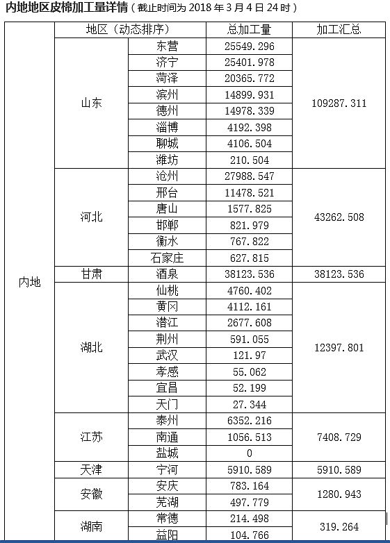 截至2018年3月4日24點(diǎn),統(tǒng)計(jì)400型加工企業(yè)皮棉加工情況: