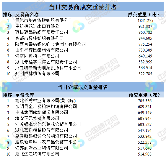 成交價(jià)格:最高成交價(jià)16310元/噸,新疆棉,平均長度29.07mm,重量170.723噸,承儲(chǔ)單位山東濱州國家糧食儲(chǔ)備庫有限公司;最低成交價(jià)13110元/噸,地產(chǎn)棉,平均長度27.32mm,重量514.314噸,承儲(chǔ)單位河北恒通棉花倉儲(chǔ)有限公司;最高加價(jià)2080元/噸,新疆棉,平均長度28.33mm,重量169.374噸,承儲(chǔ)單位湖南華杰物流有限公司。