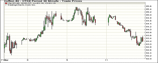 12日紐約期棉市場(chǎng)近跌遠(yuǎn)漲,1805合約結(jié)算價(jià)83.28美分,跌124點(diǎn);1807合約結(jié)算價(jià)83.21美分,跌98點(diǎn);1812合約結(jié)算價(jià)78.72美分,不變;1903合約結(jié)算價(jià)78.83美分,漲3點(diǎn)。其他合約上漲6-10點(diǎn)不等。當(dāng)日5月合約小幅低開(kāi),整日交易重心向下,開(kāi)盤(pán)后因賣(mài)盤(pán)打壓市場(chǎng)下行,跌至84.5美分處尋找支撐,但因賣(mài)盤(pán)壓力過(guò)重重心繼續(xù)向下,后跌破83.5美分后買(mǎi)盤(pán)入場(chǎng),市場(chǎng)受支撐短暫反彈,但因上漲動(dòng)力不足掉頭向下,跌幅加深,最終收于近低點(diǎn)。外圍美元指數(shù)下跌,玉米期貨不變,小麥和大豆期貨上漲。