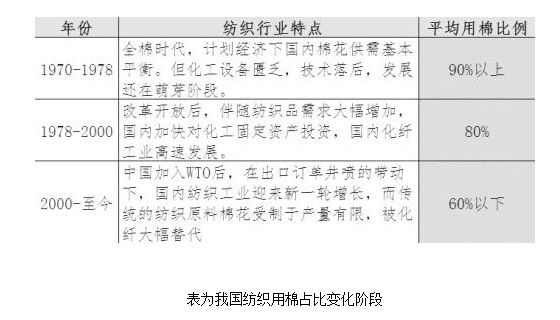 從細(xì)處看化纖替代棉花主要有兩方面原因。一、對紡織產(chǎn)品要求更加多樣化,化纖原料可以彌補(bǔ)棉花產(chǎn)品特性上的不足。二、可紡化纖具有價格優(yōu)勢。2005年以前用棉比例下降主要出于第一個原因。滌綸等化纖具備良好的力學(xué)性能、耐熱性和色牢度,密度小、織物輕、彈性好、耐疲勞破壞等優(yōu)點(diǎn),雖不具備棉花吸濕親膚、柔軟的特性,卻彌補(bǔ)棉花易褪色和變形等劣勢。