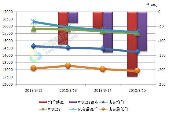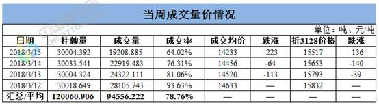 累計情況:截至3月15日,累計計劃出庫12萬噸,累計出庫成交9.46萬噸,成交率78.76%;成交平均價14461元/噸,折3128價格15699元/噸,成交最高價16790元/噸,最低價11990元/噸。