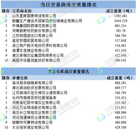 成交價格:最高成交價15590元/噸,新疆棉,平均長度28.94mm,重量42.272噸,承儲單位安徽省棉麻公司宿州中轉(zhuǎn)儲備庫;最低成交價12940元/噸,地產(chǎn)棉,平均長度27.31mm,重量488.071噸,承儲單位河北恒通棉花倉儲有限公司;最高加價1660元/噸,新疆棉,平均長度28.63mm,重量340.422噸,承儲單位連云港新蘇豫棉花儲運有限公司。