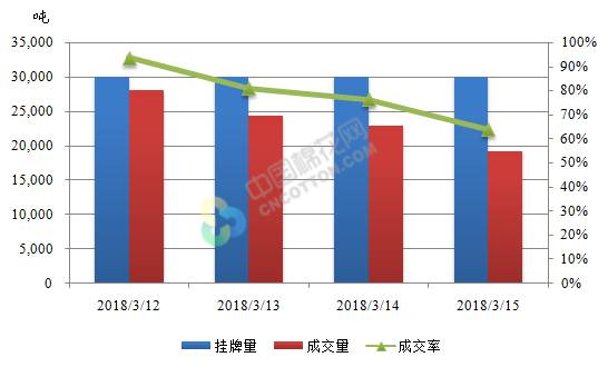 3月15日儲備棉輪出銷售資源30004.392噸,實際成交19208.885噸,成交率64.02%。平均成交價格14233元/噸(較前一日下跌223元/噸);折3128價格15517元/噸(較前一日下跌136元/噸)?!?/p>