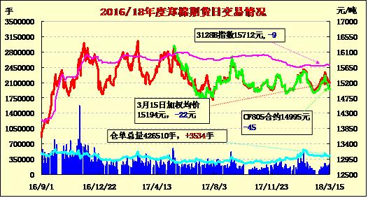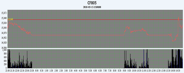 | CF805 | 15000 | 15065 | 14930 | 15005 | 14995 | -45 | 146588 | 39100 | 12374596 | 222460 | -9706 |