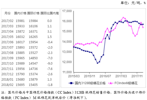 (三)國內(nèi)外棉價差再度拉大。2月CotlookA指數(shù)(相當(dāng)于國內(nèi)3128B級棉花)折合人民幣每噸12519元,比中國棉花價格指數(shù)(CCIndex)3128B級每噸低3176元,價差較上月擴(kuò)大773元。進(jìn)口棉價格指數(shù)(FCIndex)M級(相當(dāng)于國內(nèi)3128B級棉花)月均價每磅88.43美分,1%關(guān)稅下折到岸稅后價每噸14261元,比國內(nèi)價格低1434元,價差較上月擴(kuò)大692元;滑準(zhǔn)稅下折到岸稅后價每噸15405元,比國內(nèi)價格低290元。