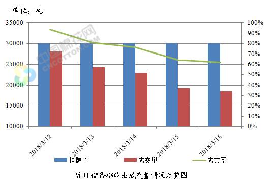 3月16日儲(chǔ)備棉輪出銷售資源30004.679噸,實(shí)際成交18470.984噸,成交率61.56%。平均成交價(jià)格14374元/噸(較前一日上漲141元/噸);折3128價(jià)格15568元/噸(較前一日上漲51元/噸)。