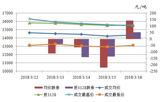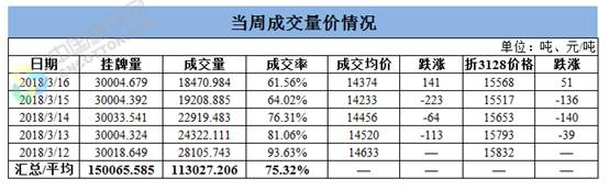 累計(jì)情況:截至3月16日,累計(jì)計(jì)劃出庫15.01萬噸,累計(jì)出庫成交11.30萬噸,成交率75.32%;成交平均價(jià)14443元/噸,折3128價(jià)格15673元/噸,成交最高價(jià)16310元/噸,最低價(jià)12940元/噸。