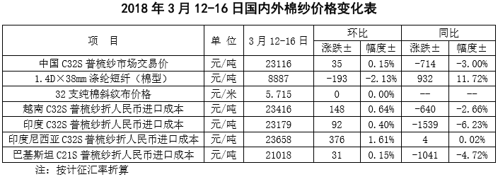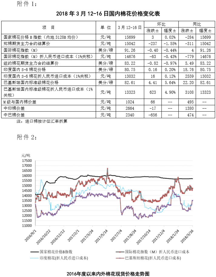 附件1:2018年3月12-16日國內(nèi)外棉花價(jià)格變化表
