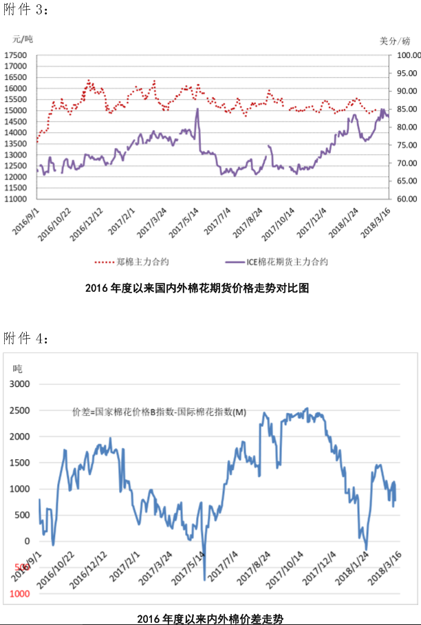 本周貿(mào)易戰(zhàn)風(fēng)險(xiǎn)攪動(dòng)全球資本市場,部分投資基金了結(jié)多頭頭寸,ICE期棉價(jià)格下跌,國際現(xiàn)貨棉價(jià)隨之回落。3月12-16日紐約棉花期貨主力合約結(jié)算價(jià)83.22美分/磅,較上周下跌0.82美分/磅,跌幅0.97%;代表進(jìn)口棉中國主港到岸均價(jià)的國際棉花指數(shù)(M)為91.26美分/磅,較上周下跌0.4美分/磅,跌幅0.44%,折人民幣進(jìn)口成本14676元/噸(按計(jì)征匯率折算,下同),較上周下跌63元/噸,跌幅0.43%,低于國內(nèi)市場1024元/噸,內(nèi)外棉價(jià)差較上周擴(kuò)大66元/噸(詳見附件1)。