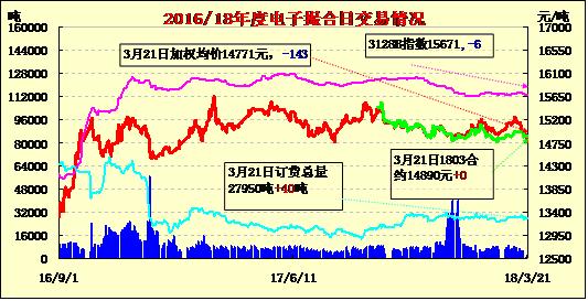21日電子撮合交易成交量增加,合同均價多數(shù)收跌。其中MA1804成交量較大,為620噸;MA1807訂貨量最大,累計訂貨量為7230噸。近期美棉部分ON-CALL訂單在期價大幅回調(diào)后點價及空頭回補為棉價提供買盤,周二晚紐約期棉止跌大幅反彈,主力5月合約收高1.85美分至83.08美分/磅,期價收復(fù)前日失地,但并未改變回調(diào)走勢; 印度官員表示由于蟲災(zāi)可能導(dǎo)致印度2018/19年度植棉面積下降12%,這將導(dǎo)致印度產(chǎn)量下降60萬噸左右。
