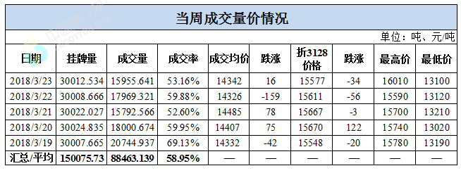 累計(jì)情況:截至3月23日,累計(jì)計(jì)劃出庫(kù)30萬(wàn)噸,累計(jì)出庫(kù)成交20.15萬(wàn)噸,成交率67.13%;成交最高價(jià)16310元/噸,最低價(jià)12940元/噸。