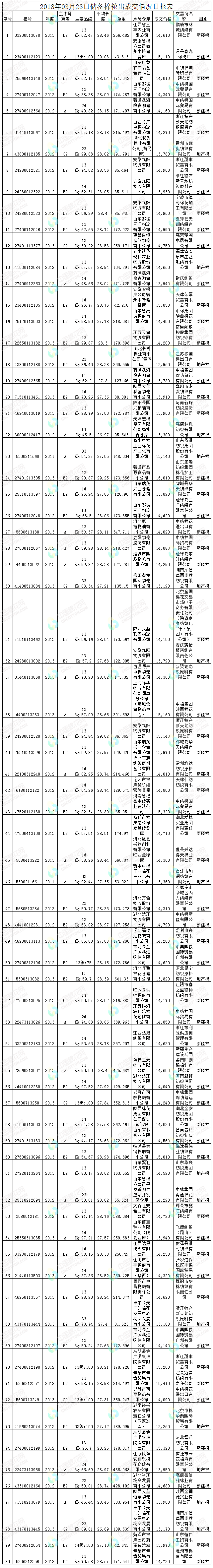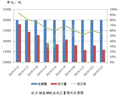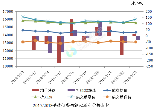 3月23日儲(chǔ)備棉輪出銷售資源30012.534噸,實(shí)際成交15955.641噸,成交率53.16%。平均成交價(jià)格14342元/噸(較前一日上漲16元/噸);折3128價(jià)格15577元/噸(較前一日下跌34元/噸)?!?/p>