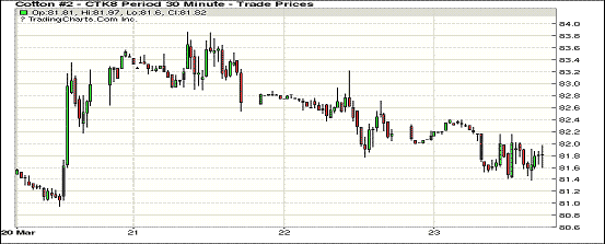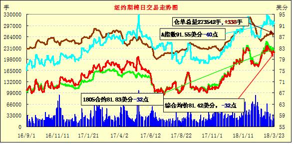 23日紐約期棉市場整體收跌,1805合約結(jié)算價(jià)81.83美分,跌32點(diǎn);1807合約結(jié)算價(jià)82.22美分,跌18點(diǎn);1812合約結(jié)算價(jià)77.66美分,跌29點(diǎn);1903合約結(jié)算價(jià)77.85美分,跌28點(diǎn)。當(dāng)日5月合約小幅高開,開盤后受支撐上行至當(dāng)日高點(diǎn)82.39美分,后賣盤入場市場承壓下行,跌破82美分后低點(diǎn)處買盤發(fā)力交易重心走高,該合約幾次試圖穩(wěn)定在82美分之上失敗,因上漲動(dòng)力不足最終小幅收跌。據(jù)美國農(nóng)業(yè)部(USDA),3.8-3.15日一周美國凈簽約出口2017/18年度陸地棉76748噸(含新簽約80082噸,另取消3334噸前期訂單),較前一周增加5%,但較近4周平均簽約量減少3%;裝運(yùn)2017/18年度陸地棉96411噸,較前一周增加3%,較近4周平均增加10%。外圍美元指數(shù)下跌,大豆期貨下跌,玉米和小麥期貨上漲。