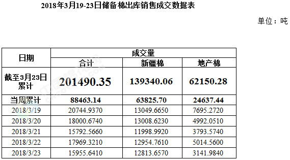 上周(2018年3月19日-23日),2017/18年度儲備棉輪出第二周,中國儲備棉管理有限公司計劃出庫銷售儲備棉15.01萬噸,實際成交8.85萬噸,成交率58.95%,其中新疆棉成交6.38萬噸,成交率100%,地產(chǎn)棉成交2.46萬噸,成交率28.57%。從成交價格看,成交平均價14375元/噸,折標準級(3128)價格15612元/噸,其中新疆棉成交均價14565元/噸,平均加價625元/噸;地產(chǎn)棉成交均價13865元/噸,平均加價145元/噸。