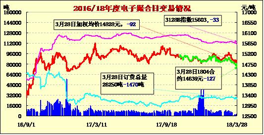 28日電子撮合交易成交量減少,合同均價(jià)全部收跌。其中MA1806成交量較大,為480噸;活躍交投的合同多集中于中期合同,MA1807訂貨量最大,累計(jì)訂貨量為6960噸。美國(guó)德州天氣引發(fā)市場(chǎng)持續(xù)關(guān)注,目前西德州旱情持續(xù),且近期尚無(wú)降雨預(yù)報(bào)。5月合約小幅高開(kāi),開(kāi)盤(pán)后在81.80-82.20美分區(qū)間震蕩運(yùn)行,后受支撐交易重心上行,至82.50美分處賣(mài)盤(pán)入場(chǎng)市場(chǎng)被打壓,一路向下跌至當(dāng)日低點(diǎn)81.72美分,于低點(diǎn)處買(mǎi)盤(pán)發(fā)力,市場(chǎng)飆升至當(dāng)日高點(diǎn),后受獲利了結(jié)盤(pán)打壓回落,最終以小幅上漲收盤(pán)。1805合約結(jié)束連續(xù)四日跌勢(shì)。