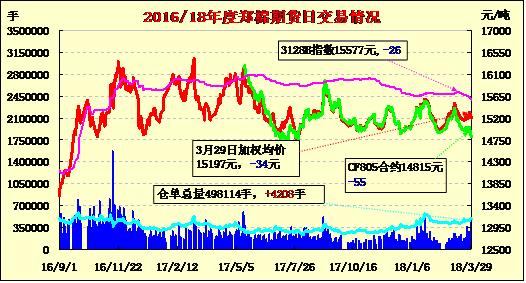 | CF809 | 15285 | 15335 | 15220 | 15245 | 15280 | -80 | 127914 | -155772 | 2411258 | 265140 | 8630 |