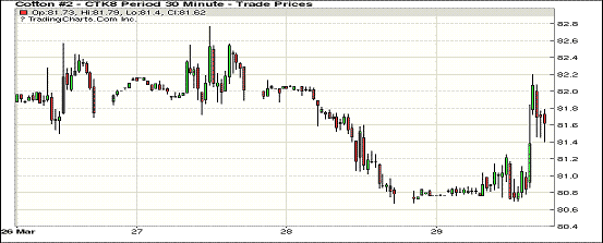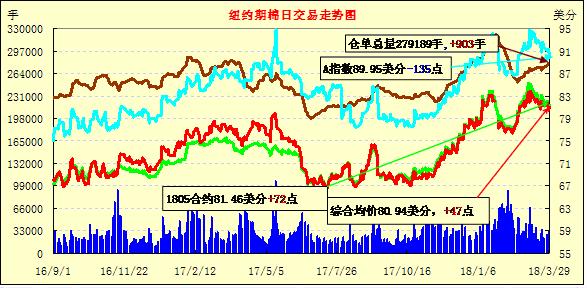 29日為紐約三月份最后一個(gè)交易日。1805合約結(jié)算價(jià)81.46美分,漲72點(diǎn);1807合約結(jié)算價(jià)81.80美分,漲62點(diǎn);1812合約結(jié)算價(jià)77.73美分,漲74點(diǎn);1903合約結(jié)算價(jià)77.82美分,漲59點(diǎn)。當(dāng)日5月合約穩(wěn)定開盤,開盤后在圍繞80.8美分一線窄幅震蕩運(yùn)行,在美棉出口周報(bào)發(fā)布前,市場(chǎng)小幅走高,在報(bào)告發(fā)布后不敵賣盤壓力回落,午后USDA發(fā)布新年度意向種植預(yù)期報(bào)告,市場(chǎng)受提振躥高,至當(dāng)日高點(diǎn)82.20美分處賣盤入場(chǎng),承壓走低,最終小幅收漲。據(jù)美國(guó)農(nóng)業(yè)部3月份意向種植預(yù)期報(bào)告,2018/19年度美棉種植面積1346.9萬英畝,較本年度增6.8%。其中陸地棉面積1320.7萬英畝,同比增6.9%;皮馬棉26.2萬英畝,同比增4.2%。據(jù)美國(guó)農(nóng)業(yè)部(USDA),3.15-3.22日一周美國(guó)凈簽約出口2017/18年度陸地棉69014噸;裝運(yùn)2017/18年度陸地棉99428噸。凈簽約出口2018/19年度陸地棉14084噸。30日為公共假期,紐約期棉將休市一天。外圍美元指數(shù)上漲,玉米、大豆和小麥期貨上漲。