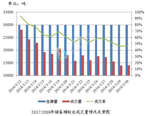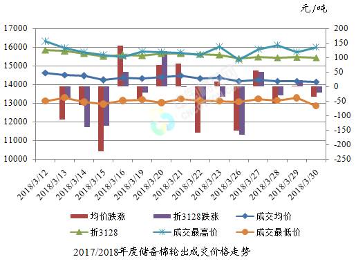 3月30日儲備棉輪出銷售資源30000.079噸,實際成交14005.458噸,成交率46.68%。平均成交價格14153元/噸(較前一日下跌36元/噸);折3128價格15432元/噸(較前一日下跌20元/噸)。