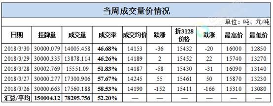 累計情況:截至3月30日,累計計劃出庫45.01萬噸,累計出庫成交27.98萬噸,成交率為62.15%;成交最高價16310元/噸,最低價12850元/噸。