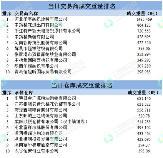 地產(chǎn)棉成交3747.401噸,成交率18.98%,成交均價13552元/噸,平均加價226元/噸,最高成交價14440元/噸,最低成交價12850元/噸;新疆棉成交10258.057噸,成交率100%,成交均價14373元/噸,平均加價490元/噸,最高成交價16000元/噸,最低成交價13710元/噸。